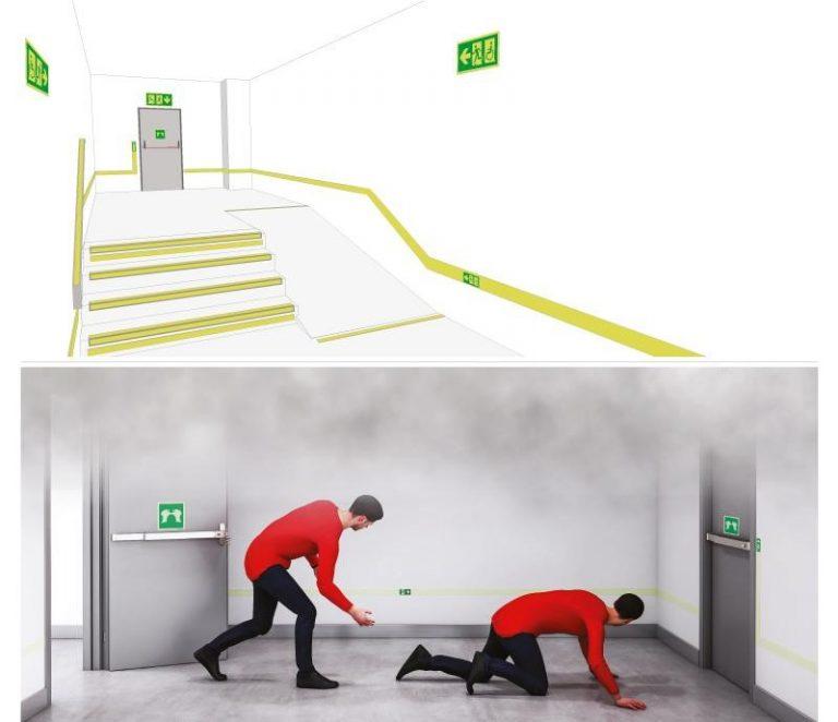 Asimismo, el Código Técnico de la Edificación (CTE), en su Documento Básico SI (Seguridad en caso de incendio), establece que los recorridos de evacuación deben estar señalizados de manera continua y clara, incluyendo señalización horizontal luminiscente en caso de fallo del alumbrado. La normativa UNE 23035 regula específicamente la señalización fotoluminiscente, de aplicación en entornos de evacuación para garantizar la visibilidad en condiciones de oscuridad.